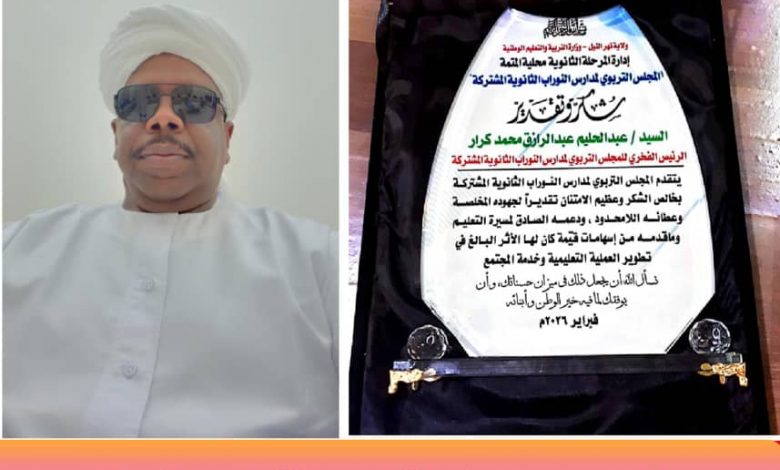 اعلن ممثل المجلس التربوي لمدارس النوراب الثانوية المشتركة مبارك عبدالرحيم باحميد خلال كلمته في كرنفال الطلاب المتفوفين في الشهادة السودانية دفعتي 2023م-2024م اعلن اجماع اعضاء المجلس التربوي عن اختيار رجل البر والاحسان عبد الحليم عبدالرازق رئيسا فخريا للمجلس مبينا ان هذا الاختيار ياتي وفاء وعرفانا لمقدمه عبدالحليم خدمة ودعم لامحدود للتعليم بالمنطقة وتقدير له ولدوره في خدمة المجتمع. وقد تم تكريم عبدالحليم في البرنامج من قبل المدير التنفيذي لمحلية المتمة.